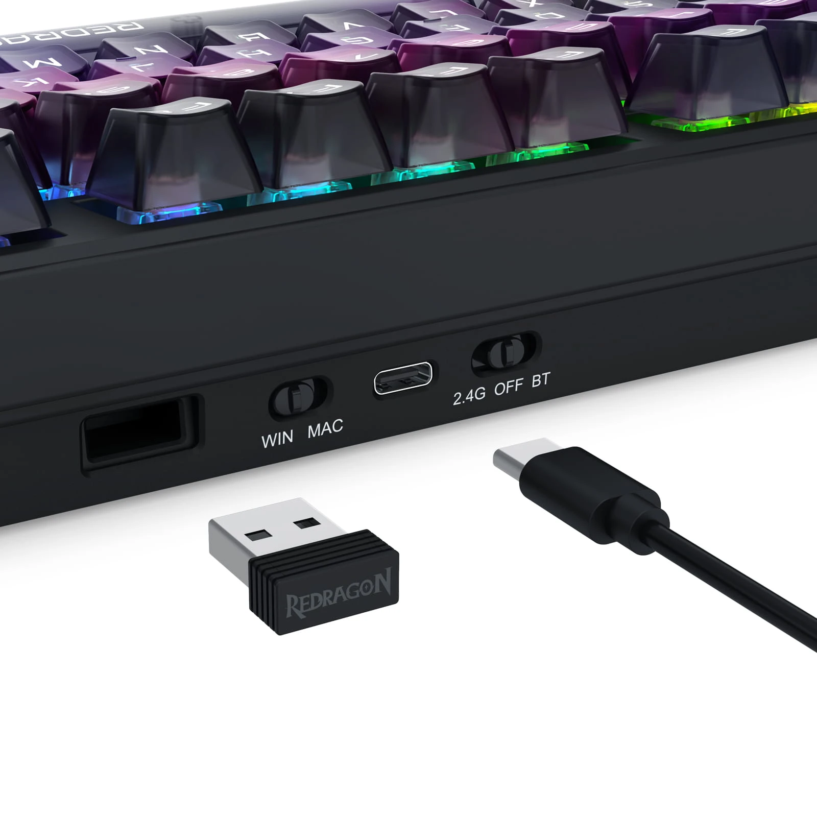 - Dołączone wyposażenie Klawiatura Redragon Bartlett, kabel USB-C, odbiornik 2.4 Ghz, narzędzie do ściągania klawiszy i przełączników, 2x zapasowe przełączniki, naklejka Redragon, instrukcja obsługi.