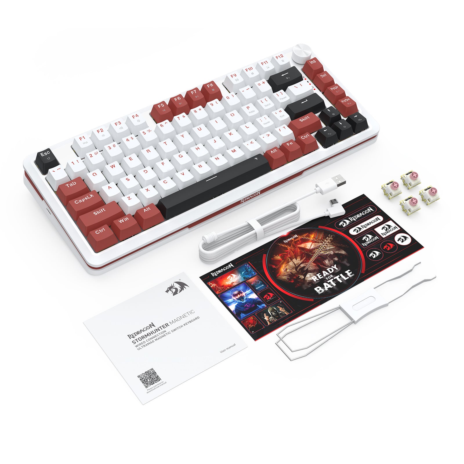 Redragon Stormhunter Magnetic K721WRB-RGB-M łączy kompaktową formę z zaawansowaną technologią magnetyczną przełączników. To przewodowa klawiatura w układzie 87% TKL (Tenkeyless), która oferuje pełną kontrolę i precyzję tam, gdzie liczy się każda sekunda. Połączenie białej obudowy z czerwonymi i czarnymi akcentami nadaje stanowisku charakteru, a podświetlenie RGB (Red Green Blue) podkreśla gamingowy styl.