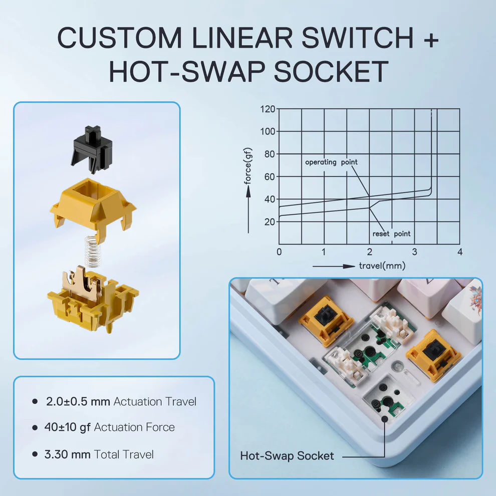 Konstrukcja gasket mount została zaprojektowana tak, by nadać klawiszom sprężysty, równy skok i zminimalizować wibracje. Dzięki temu każdy klik jest bardziej płynny i przyjemny, co zwiększa komfort zarówno w grach, jak i przy dłuższej pracy. Liniowe przełączniki Lion L wyróżniają się szybkim czasem reakcji i cichszym działaniem, sprawdzając się w dynamicznych tytułach i podczas intensywnego pisania. Z kolei hot-swap pozwala na szybką wymianę switchy, co otwiera drogę do personalizacji brzmienia i charakterystyki pracy klawiatury. To rozwiązanie łączy wysoką kulturę pracy z elastycznością dopasowaną do indywidualnych potrzeb.
